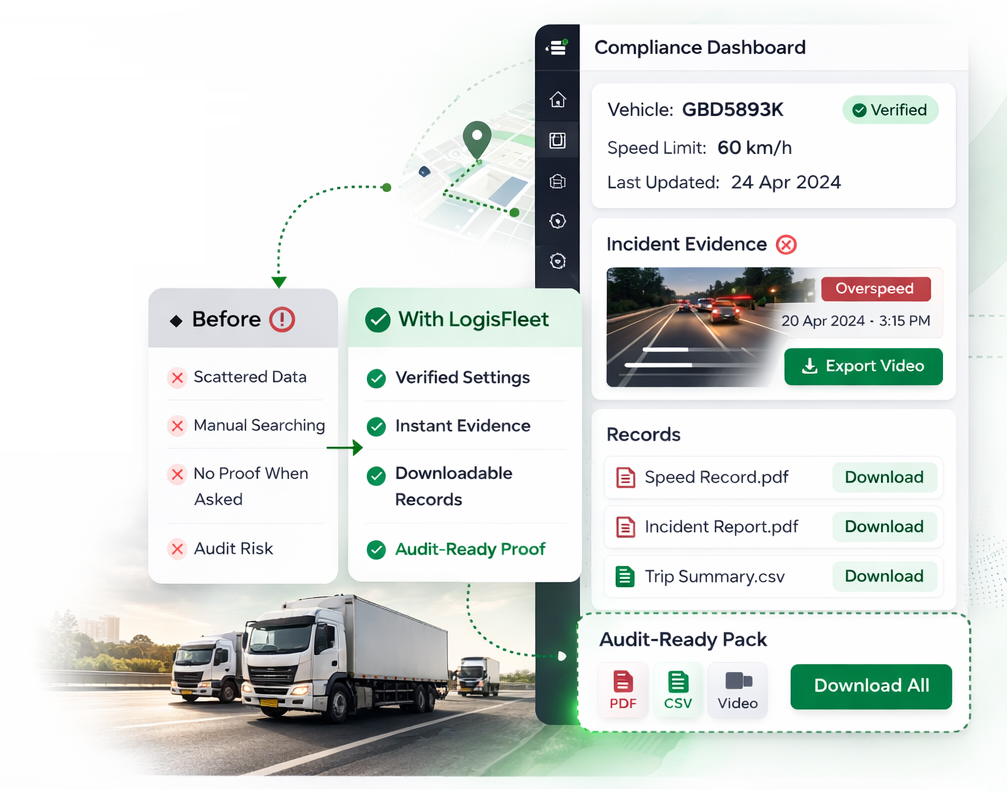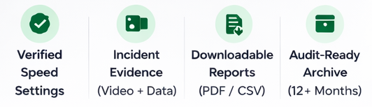 Move from scattered data to verified speed records, incident evidence, and downloadable proof — ready for audit, checks, and enforcement reviews.
